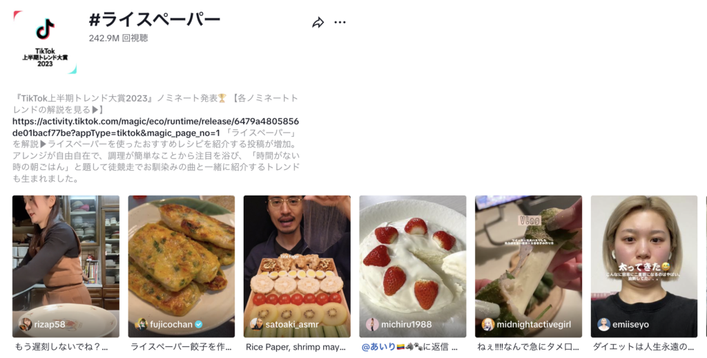 ヒットアイテム部門では、「ライスペーパー」が受賞しました。このアイテムは、調理が簡単でアレンジが自由自在なことから、TikTok内で大流行しました。