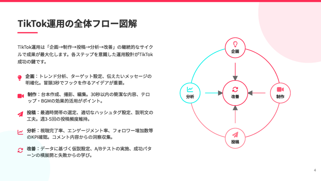 「企画→制作→投稿→分析→改善」の流れを、ステップごとに図解。