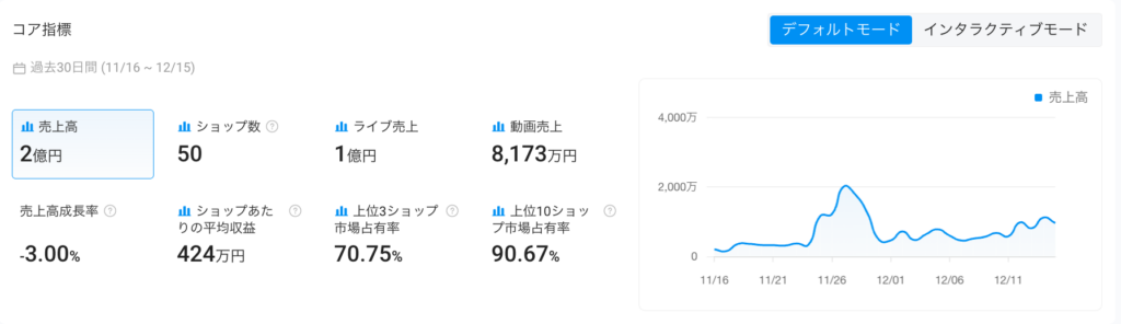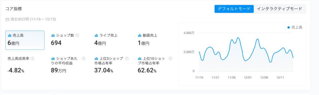このツールでは、各カテゴリの売上推移、商品別のランキング、ショップごとの販売実績など、かなり詳細なデータを見ることができます。