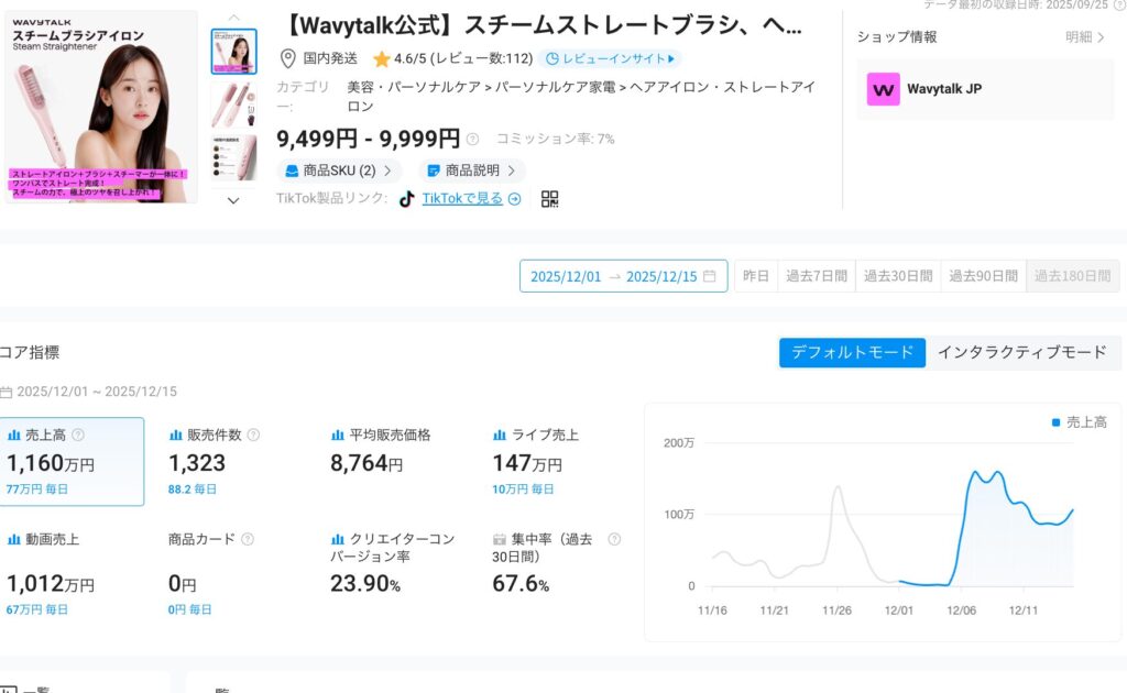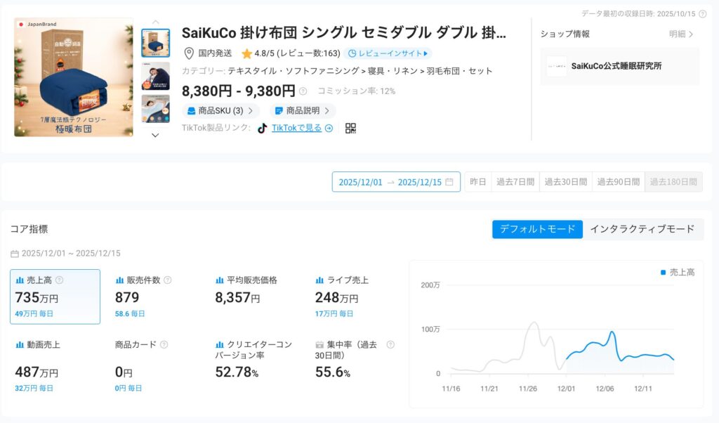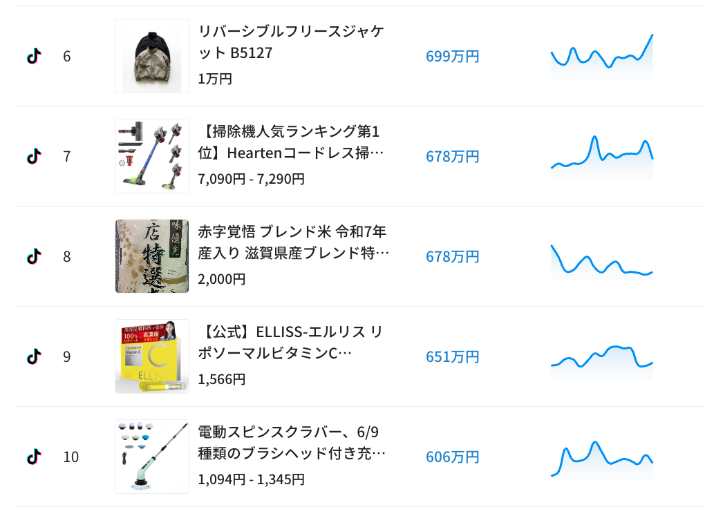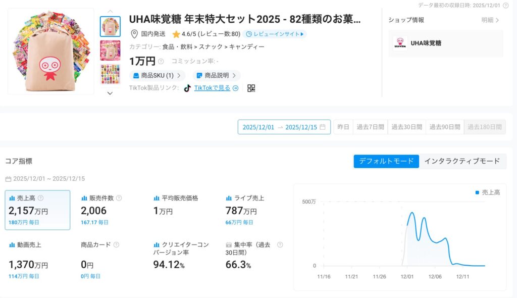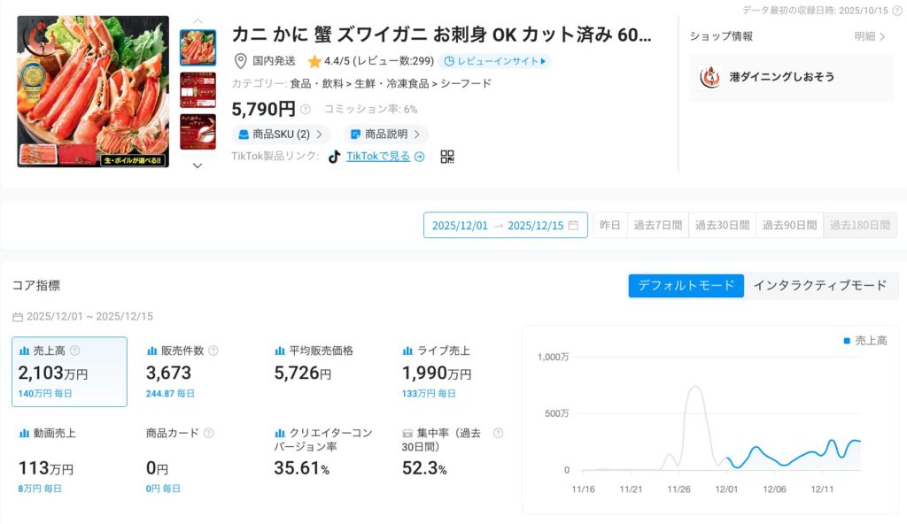 今回入手した2025年12月上半期のデータは、これまでのTikTok Shopの常識を覆すものでした。ランキングの上位には、1万円を超えるセット商品や、6,000円級の生鮮食品、高単価な美容家電が並んでいます。