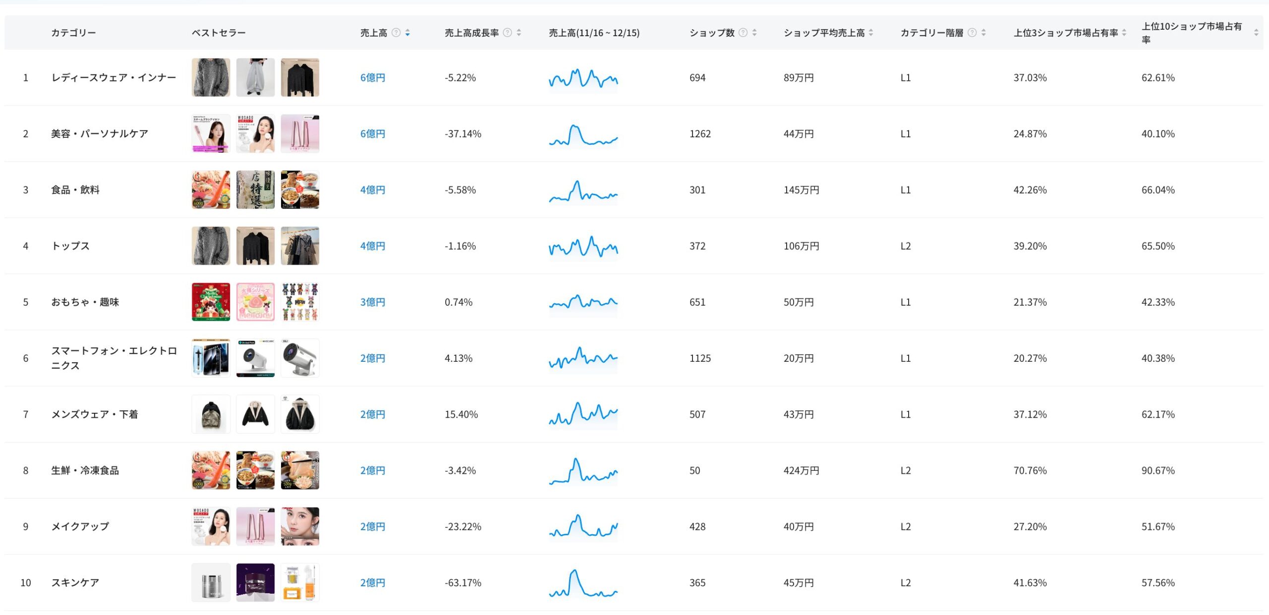 まずは個別の商品を見る前に、市場全体のマクロな動きをカテゴリーランキングで見ていきましょう。※カテゴリーのランキングは直近30日間(11/16〜12/15)のデータです。