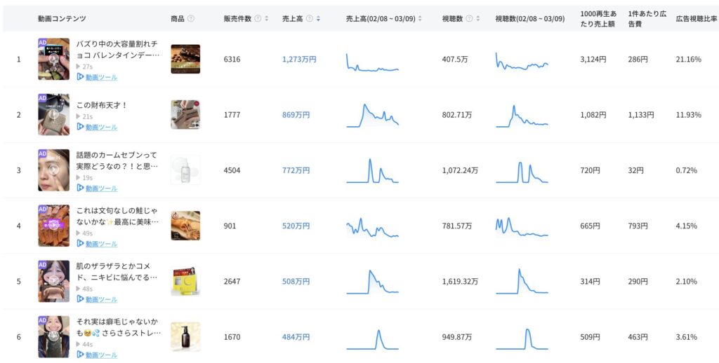 その商品を売っているクリエイターを調べて、「どんな動画で売上を出しているか」を確認します。動画の構成や訴求ポイントのパターンが見えてくると、自社コンテンツの参考になります。