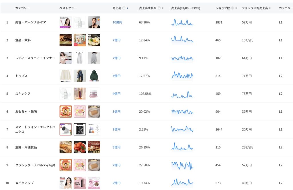 「ビューティー系は伸びてるけど競合が多い」「フード系は成長率が高い」など、参入判断の材料として重宝します。